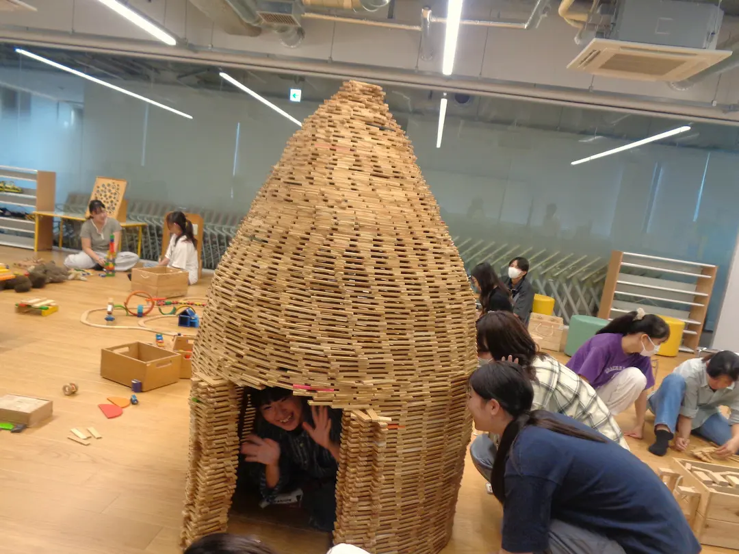 子どもサイズの椅子や机、えほんやおもちゃなどが配置され、保育施設の教室を模したつくりになっています。