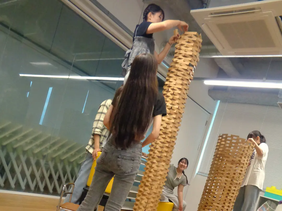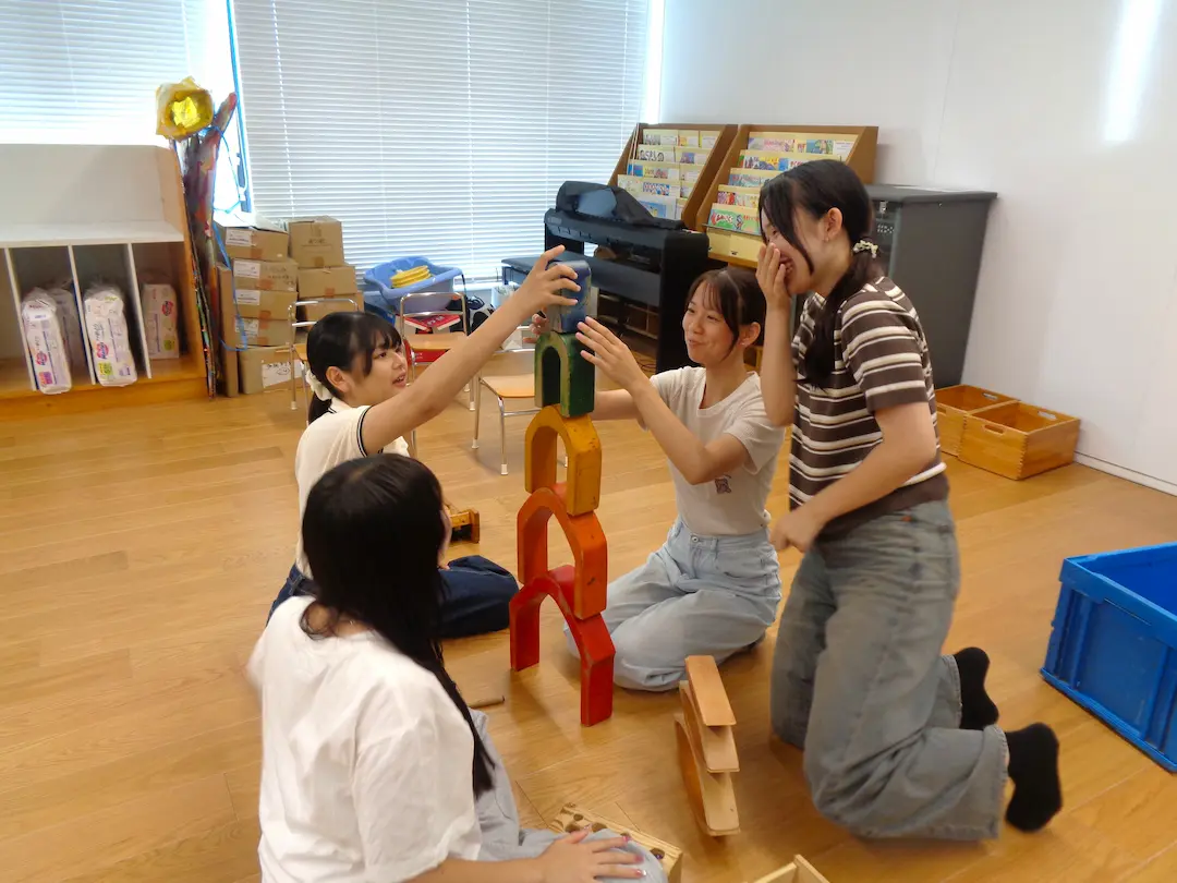 学生たちは「見たことがある!」「実習先にあった」「これはどうやって遊ぶんだろう?」と興味津々。ゼミや学年の枠を越えて笑顔で遊ぶ姿に、将来子どもと一緒に楽しむ保育者としての姿が重なり、教員も思わず笑顔になりました。