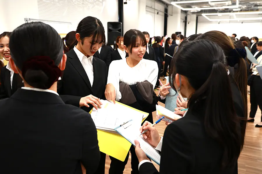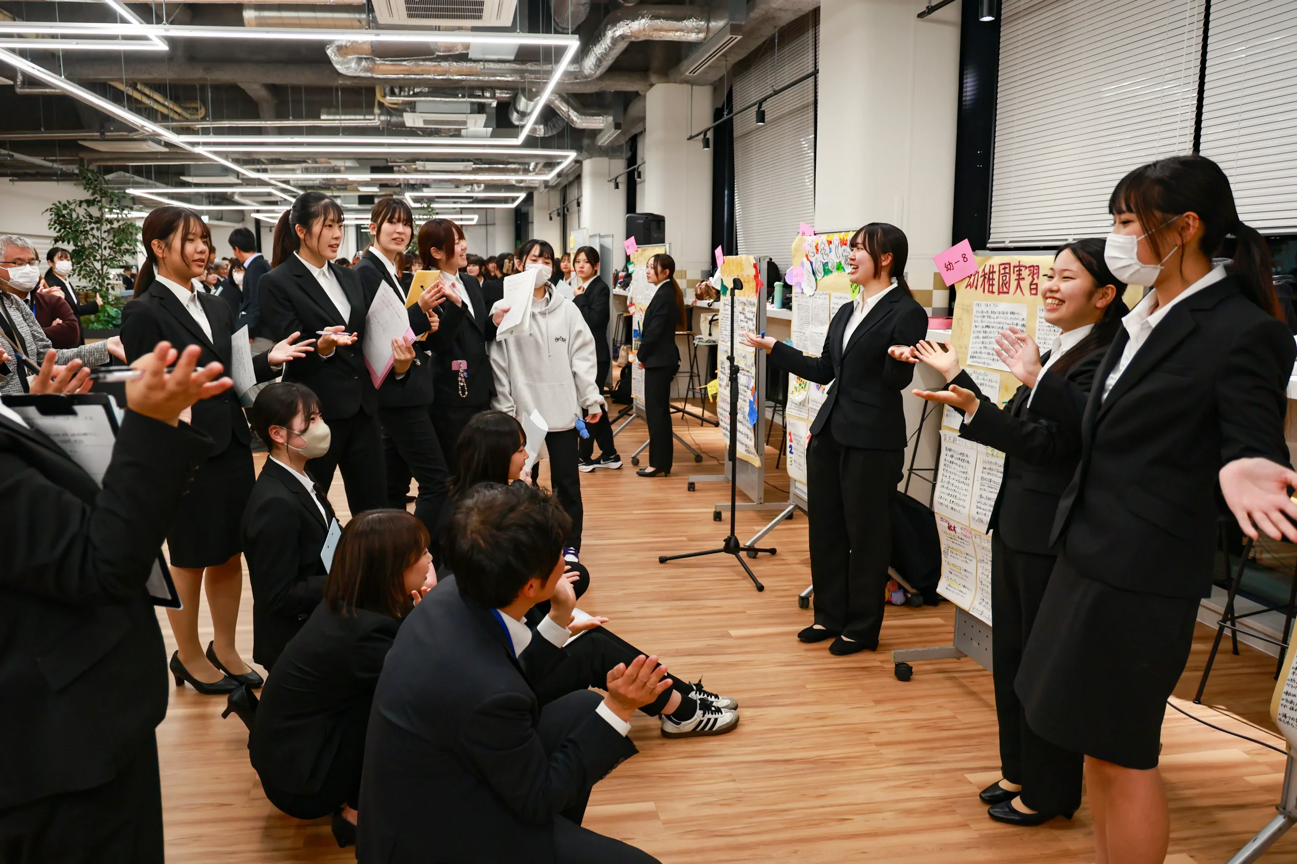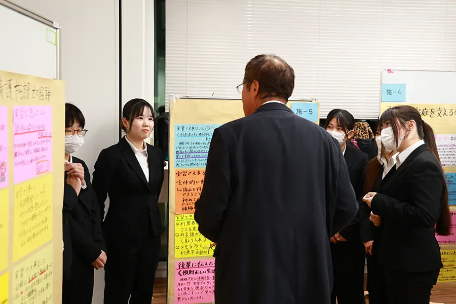 実習報告会ではグループごとに1つの実習先を選び、実習で学んだことをポスターセッション形式で発表します。来場した実習受け入れ施設の先生方や1年生に向けて成果を報告することで、学びを共有する場となっています。 学生たちは、子どもとの関わりの中で感じた難しさや自らの課題、学び得たことを具体的なエピソードを交えて紹介していました。実習でお世話になった現場の先生方も発表者に質問を投げかけ、学生が得た“気づき”を喜ぶ姿が印象的でした。1年生にとっては、先輩の体験を通して実習への理解を深め、今後の学びへの期待や意欲を高める機会にもなっています。