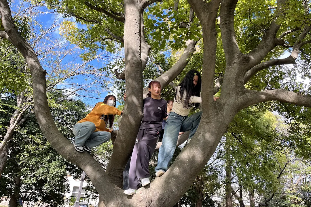 この日は、ドロケイ以外にも木登りや「だるまさんがころんだ」など、思い思いの遊びを楽しみました。あえて固定遊具は使わず、身近な自然や空間の中で遊ぶことを大切にしました。遊具がなくても子どもと一緒に楽しめる保育者になってほしい、という教員の願いが込められています。