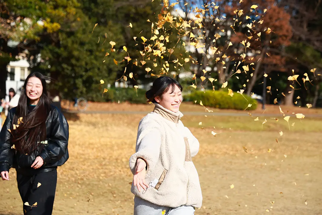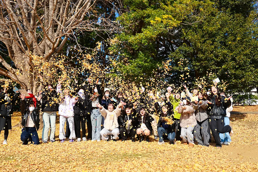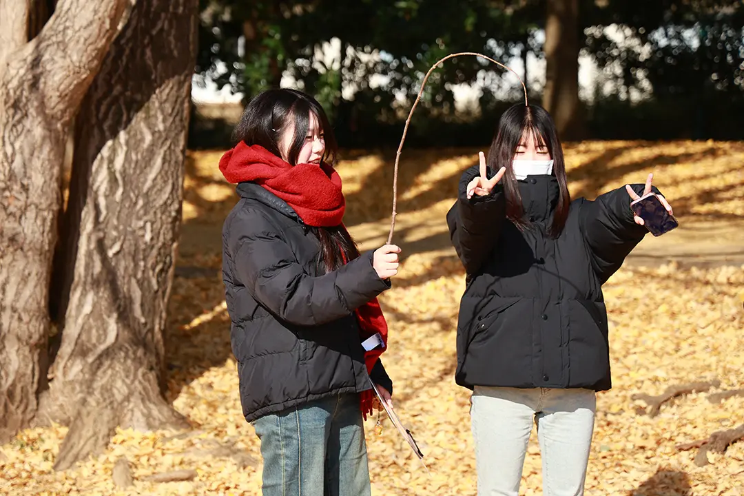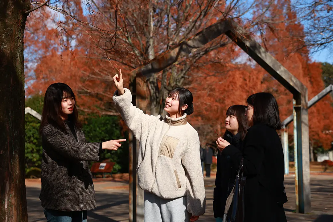 12/10(水)、今日は自然環境を活かした遊びを学ぶため、稲毛キャンパス近くの穴川中央公園を訪れました。この時期の穴川中央公園にはたくさんの落ち葉が広がり、木には山茶花(さざんか)が咲き、そこかしこに木の実が落ちています。子どもたちにそのような自然物へ興味を抱かせることで、その感触やにおい、つぶしたときの音、色の違いなど、五感を通して自然を体験させることができます。どのようにしたら子どもたちに自然への興味を持ってもらえるのでしょうか――学生たちは、5歳児が自然に触れて遊ぶ姿を想定しながら、公園内を探索し、身近な自然をどのように保育へ取り入れるかを考えていきました。