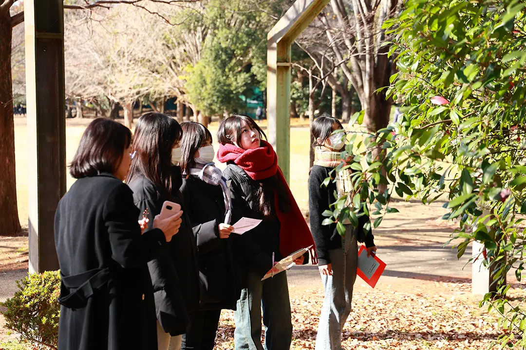 穴川中央公園に到着すると、小熊講師は山茶花の花びらを手に取り、「これは何でしょうか」と学生に問いかけます。学生からは「花びら」という答えが返ってきましたが、講師は「子どもの感性に立って表現することが大切」と伝えます。よく観察すると、花びらはピンク色のハート型にも見えます。ただ名称を伝えるだけでなく、子どもの想像力や感受性を引き出す言葉がけが、保育には欠かせません。学生たちは「自然発見カード」に、見つけた自然物とその魅力を書き込み、子どもが興味を持って遊びへと広げられる関わり方を考えました。