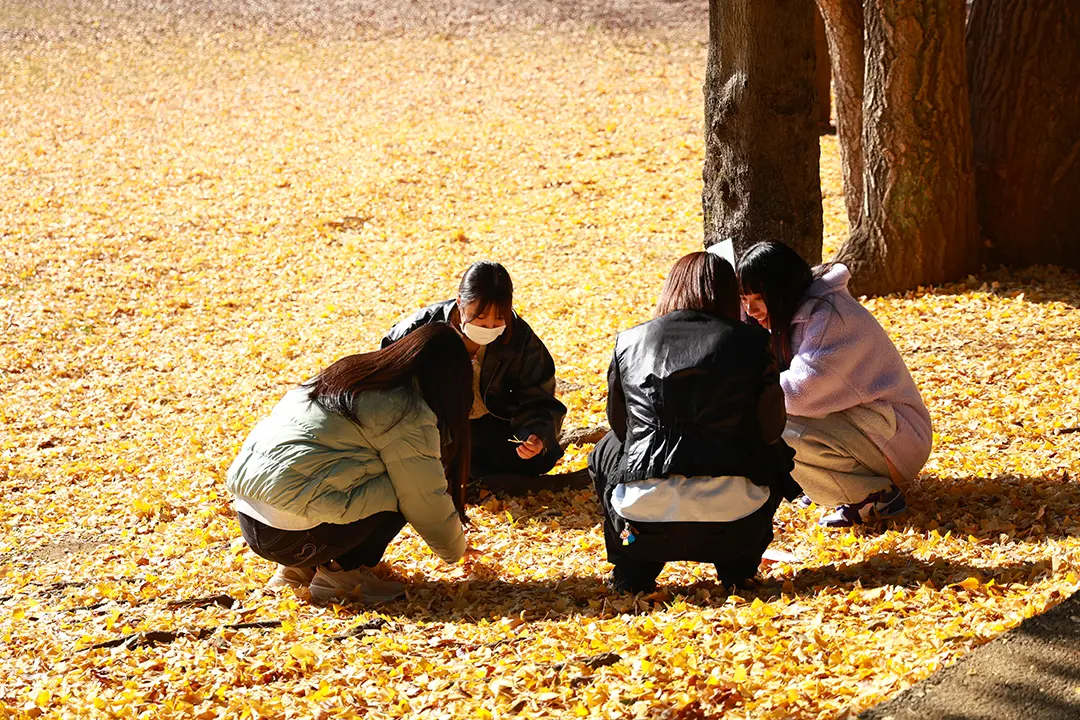 園内を歩くと、小鳥がさえずり、針葉樹の枯れ葉がサクサクと音を立て、小道の上には大小様々などんぐりが落ちていました。イチョウ並木の周辺では一面黄色の絨毯が敷かれているようで、銀杏の実も見られました。学生たちは銀杏を拾うと口々に臭いといいますが、小熊講師は「子どもの感性では違うと感じるかもしれない。大人の否定的な言葉が、子どもの感じ方を決めてしまうことがある」と指摘します。大人の言葉の選び方一つで、子どもが自然に抱く印象や興味は大きく変わるのです。