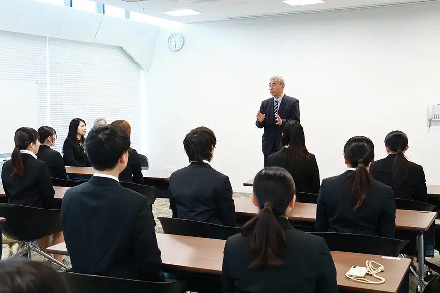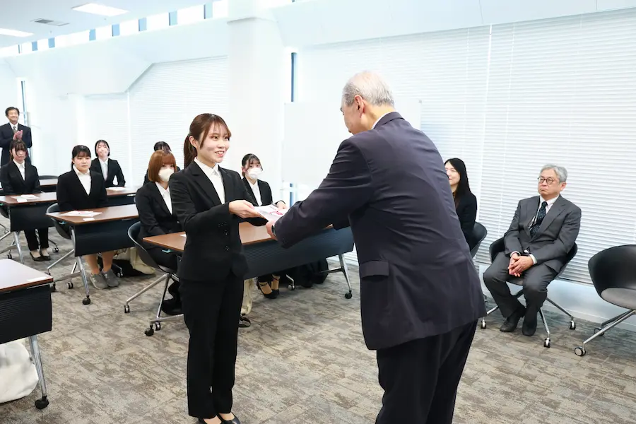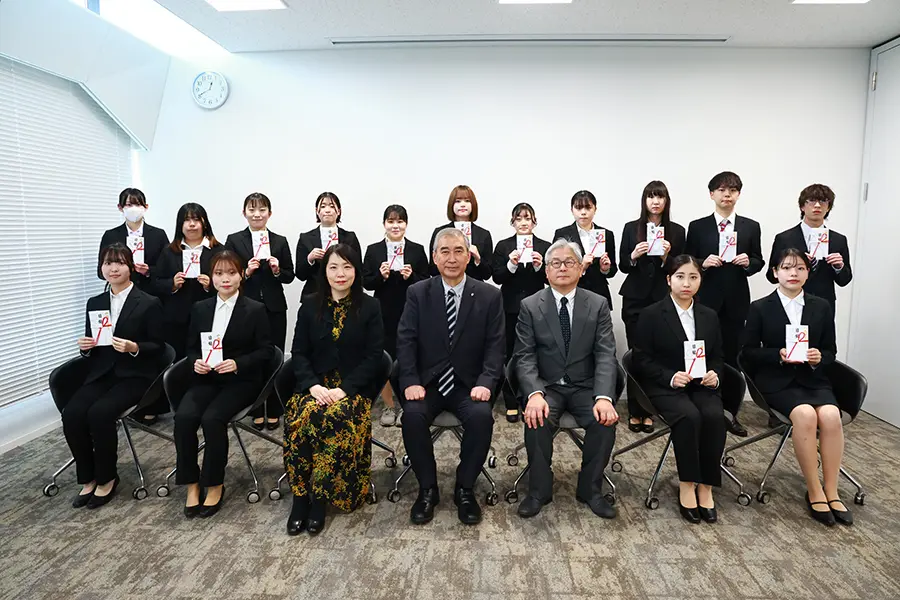 2026.01.28 令和7年度 長戸路記念奨学金交付式を実施しました 学生生活 1月21日(水)令和7年度長戸路記念奨学金交付式が行われました。この奨学金は、本学園創設者である長戸路政司先生の功績を記念して設けられた給付奨学金です。建学の精神である「敬天愛人」を実践し、優秀な成績を修めた者や課外活動等で学園の発展および社会に貢献した者として、大学生・短大生の1~4年生、計13名の学生に交付されました。 交付式の様子 敬愛短期大学からは3名が奨学金を獲得しました