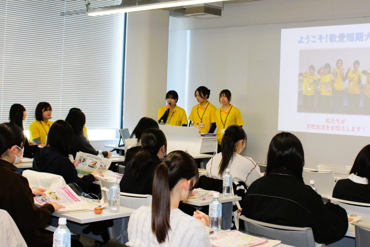 大学説明では、授業内容や実習、取得できる資格、学生生活などについて紹介しました。2年生がこれまでの経験や実体験を自分の言葉で語り、リアルな学びの様子通して、本学の特徴や魅力をお伝えしました。