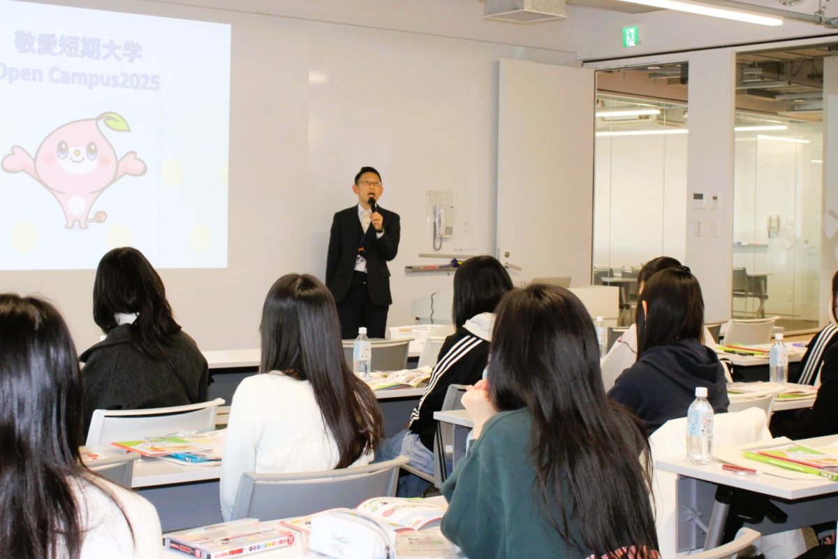 当日は、卒業を間近に控えた2年生の学生スタッフが中心となり、大学説明や模擬授業などを担当しました。参加者の皆さんは学生の話に熱心に耳を傾けながら、本学での学びやキャンパスの雰囲気を体感していました。