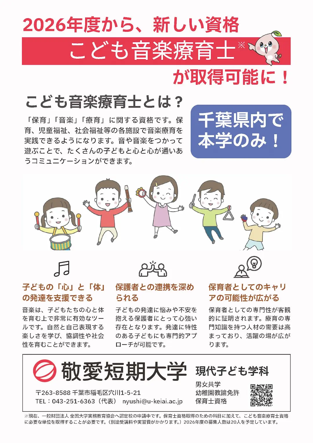 敬愛短大は県内の大学・短大に先駆けて認定絵本士養成校に指定されています。また、来年度から県内初のこども音楽療育士資格(申請中)が取得可能になります。敬愛短期大学には、子どものこころを育てる力量に富んだ保育者の育成環境があります。