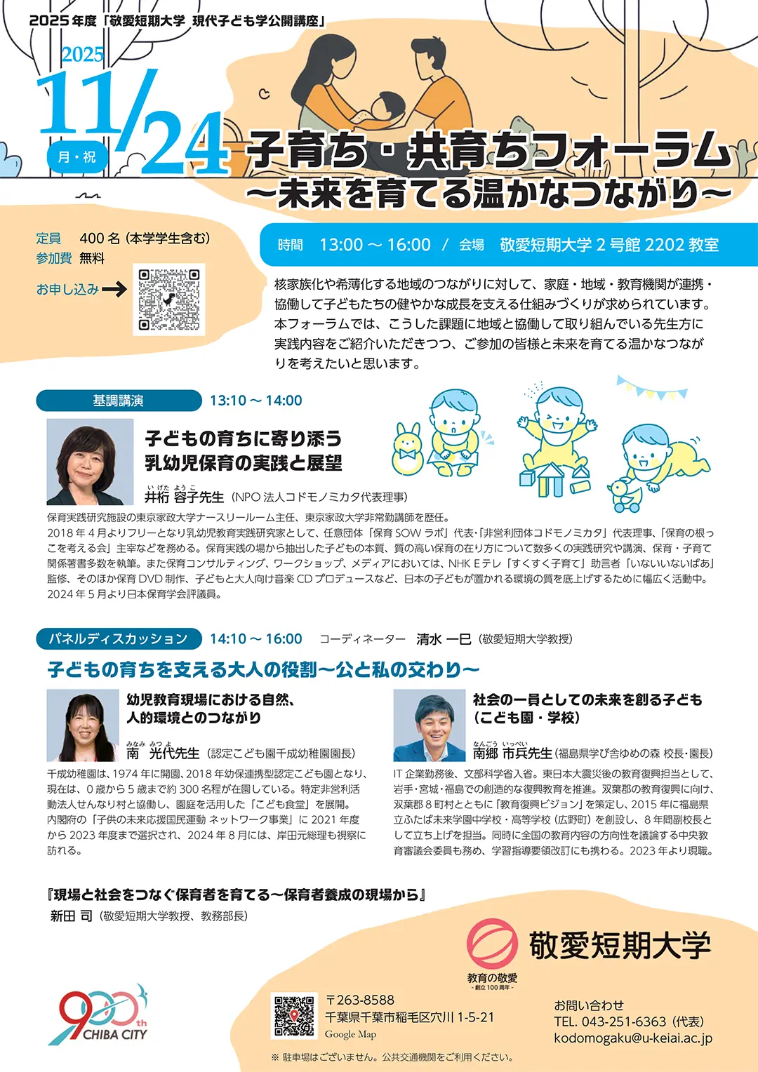 敬愛短期大学総合子ども学研究所では、公開講座「子育ち・共育ちフォーラム~未来を育てる温かなつながり~」を開催します。本フォーラムは、子どもたちの健やかな成長を支える地域・家庭・教育機関の連携のあり方を考える機会として企画されました。安心して子育てができる環境づくりを目指し、地域の親子や保育者が出会い、つながる場となることを願っています。