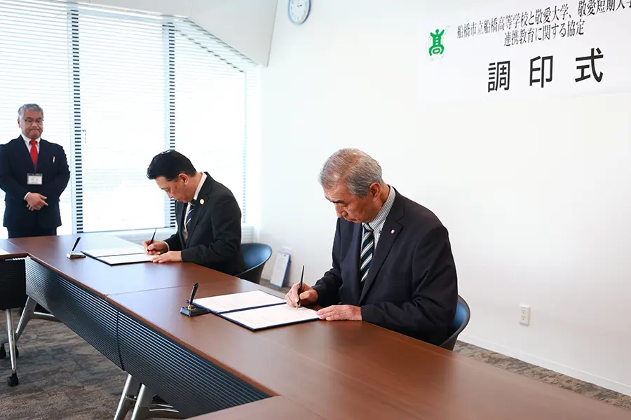 敬愛大学と敬愛短期大学は、船橋市立船橋高等学校と「連携教育に関する協定」を締結しました。市立船橋高校の生徒が大学教育への理解を深め、学びへの意欲を高めながら、自ら希望する進路を選び取れるように、高校と大学が連携して教育に取り組んでいきます。
